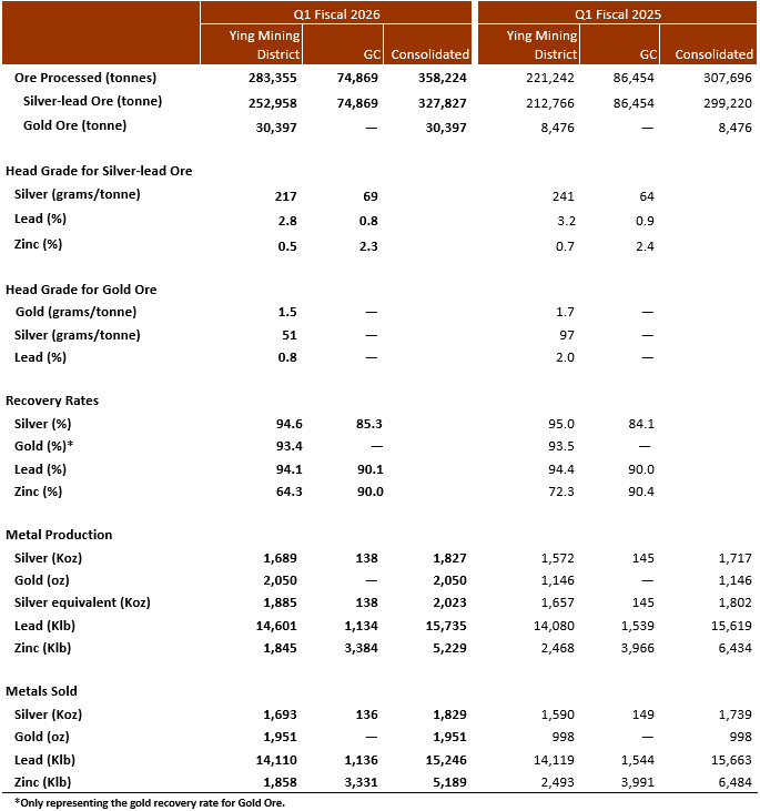 The Ying Mining District processed 283,355 tonnes of ore, up 28% over Q1 Fiscal 2025. Approximately 1,689 thousand of ounces (“Koz” ) of silver, 2,050 oz of gold, or 1,885 Koz of silver equivalent, plus 14,601 thousand of pounds (“Klb”) of lead, and 1,845 Klb of zinc were produced, representing production increases of 7%, 79%, 14%, and 4%, respectively, in silver, gold, silver equivalent and lead, and a decrease of 25% in zinc over Q1 Fiscal 2025. A total of 66,505 m of drilling and 17,624 m of exploration tunneling were completed in Q1 Fiscal 2026.